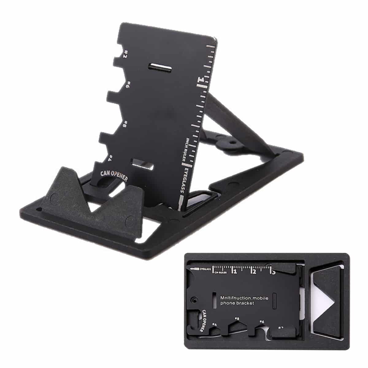 This practical yet convenient mobile phone holder comes with multi-functional screws tool card as well as bracket bottle opener that is suitable for outdoor and camping used.