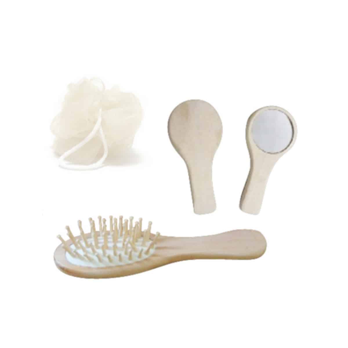 bath lily, hair brush, mirror and pouch. Portable and easy to carry go.