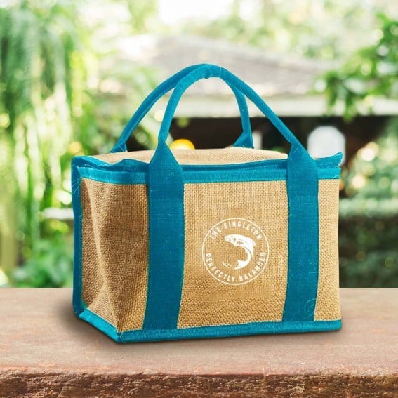 Sustainable cooler bag made of jute; eco-friendly and recyclable material. Great promotional gift for beverage, beer and wine.