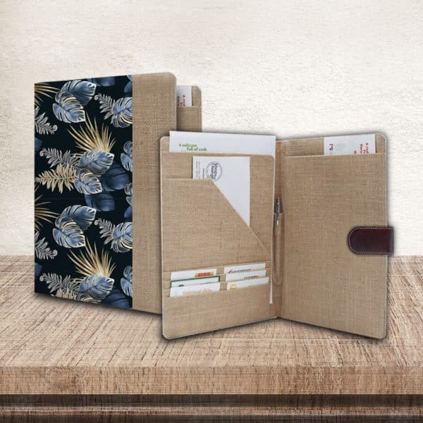 Create your unique folder made of jute with customizable logo and design. A unique and sustainable folder that keeps you professional and organized. Perfect for conference giveaway or annual gift for employees.