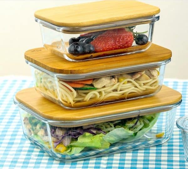 Glass food storage containers with bamboo lid and airtight silicone seal lid. Can be used as a lunch box to keep food fresh and prevent leakage The wooden bamboo lid can also double up as chopping or slicing board, making this container a convenient and versatile kitchen tool.