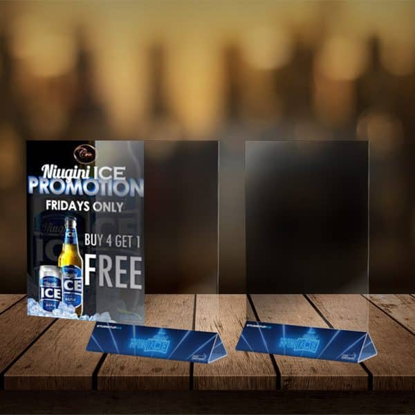Customised A5 tent card holder to be used for restaurants, bars & clubs.