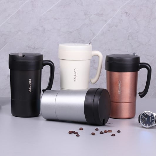 The Insulated Travel Mug with Handle can keep beverages hot or cold a longer time. The tight lid prevents any spills from happening, and the ergonomic handle makes it comfortable to hold. Perfect to keep one on work desk.